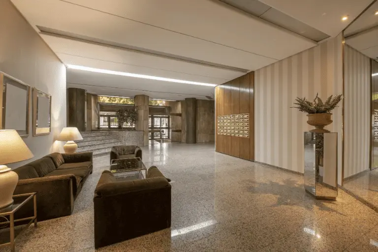 Hall de prédio residencial, representando um manual para equipes de limpeza de condomínios.