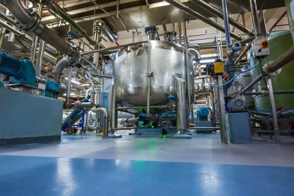 Planta industrial com equipamentos de produção, representando a limpeza industrial.