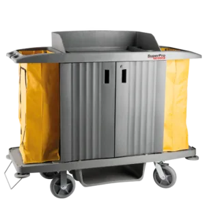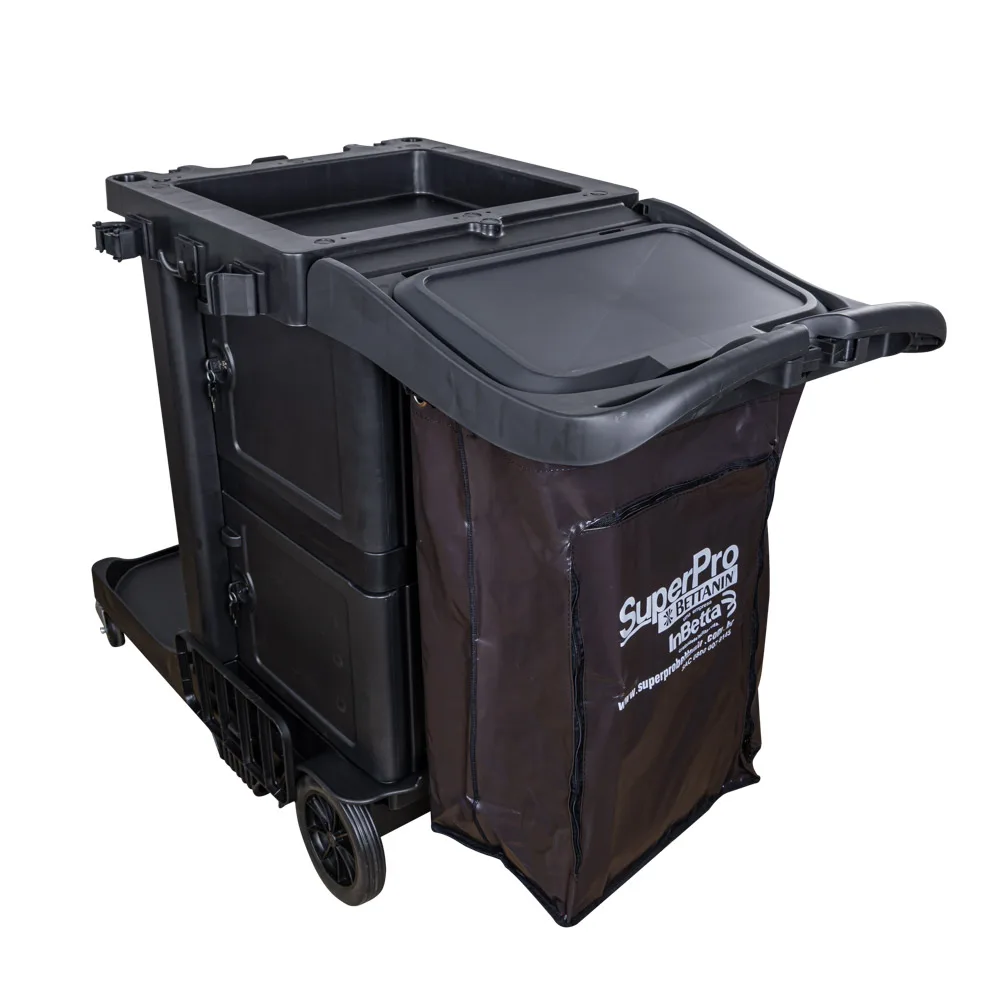 Carro funcional para transporte de produtos de limpeza. Com com compartimentos com chaves individuais para armazenagem de diferentes tipos de produtos. Prateleiras suportam até 10kg, suportes para cabos e vassouras, bolsa em vinil com capacidade de 60L ( 10 Kg).
