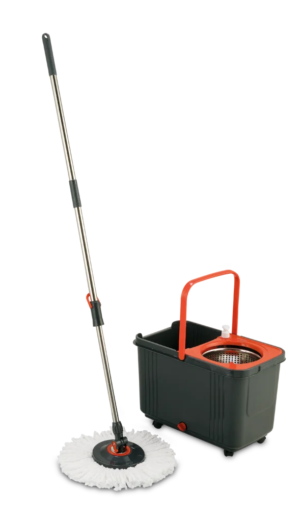 Conjunto de Mop e Balde para limpeza de pequenos ambientes. Com capacidade de 8L, acompanha 1 refil de microfibra. Possui centrífuga em aço inox, rodinhas para locomoção e reservatório para produtos químicos.